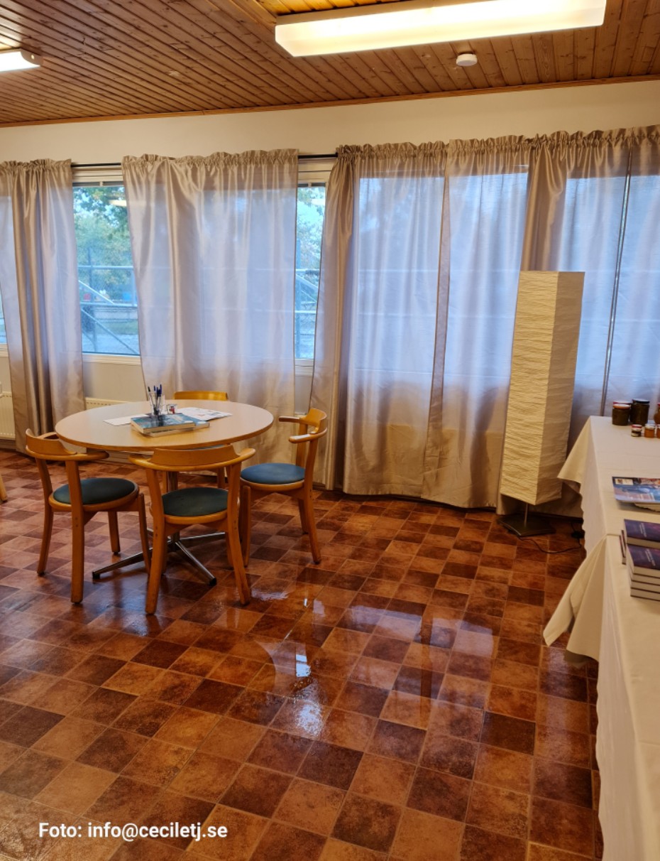 I oturen är jag ändå tacksam att mina böcker inte blev skadade. Jag hinner ändra om och förbereda allt lagom till strax före klockan 13 då mina första gäster dyker upp. Min medförfattare i antologin Att leda – från vision till verklighet, Lisa Förlin, dyker upp först. När vi sågs på bokmässan förra helgen hade hon beklagat att hon inte kunde komma till min bokrelease, men på grund av (eller kanske snarare tack vare) stormen fick hon ändrade planer och kan idag närvara på mitt firande. Det är jag också tacksam för. Till nästa språk-café den 15/11 har vi planerat att Lisa ska läsa sitt kapitel i boken och vi kommer att ha det som diskussionsunderlag. Det ska bli spännande.