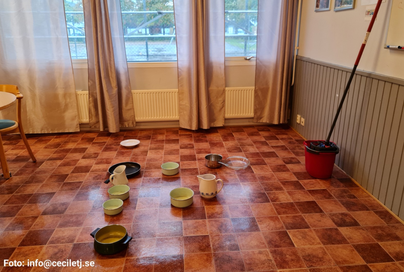 Jag ber Mats ringa jouren medan jag själv omedelbart börjar flytta mina böcker, möblerar om i lokalen, torkar den enorma pölen som har bildats på golvet samt ställer diverse behållare, bringare, kastruller och stekpannor, allt jag hittar som kan fånga de ihärdiga dropparna som oförtrutet droppar ner från taket.