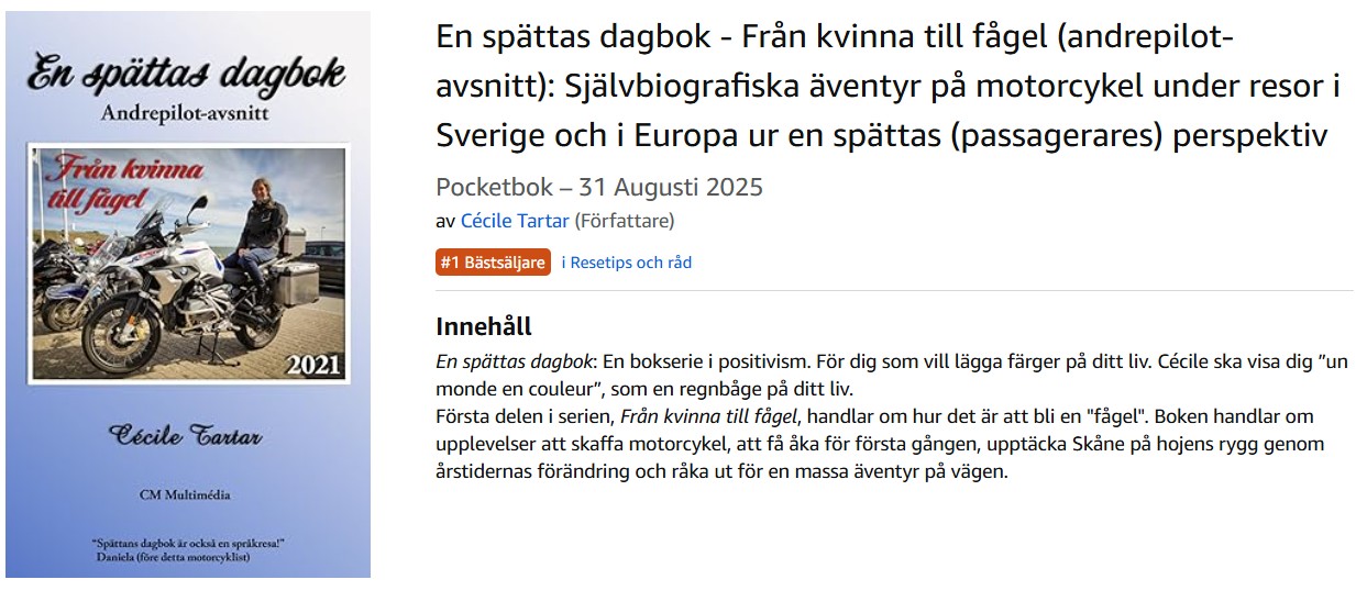 ”’En spättas dagbok’ av Cécile Tartar är något så ovanligt som en skildring av livet som passagerare på en motorcykel. Livsbejakande och underhållande berättar Cécile om spännande, vackra och ibland lite skrämmande upplevelser på bönpallen, tillsammans med sin man och chaufför. En läsvärd berättelse vare sig du är motorcykelintresserad eller bara vill ha en glimt av en annorlunda livsstil.” Lennart (Chefredaktör)