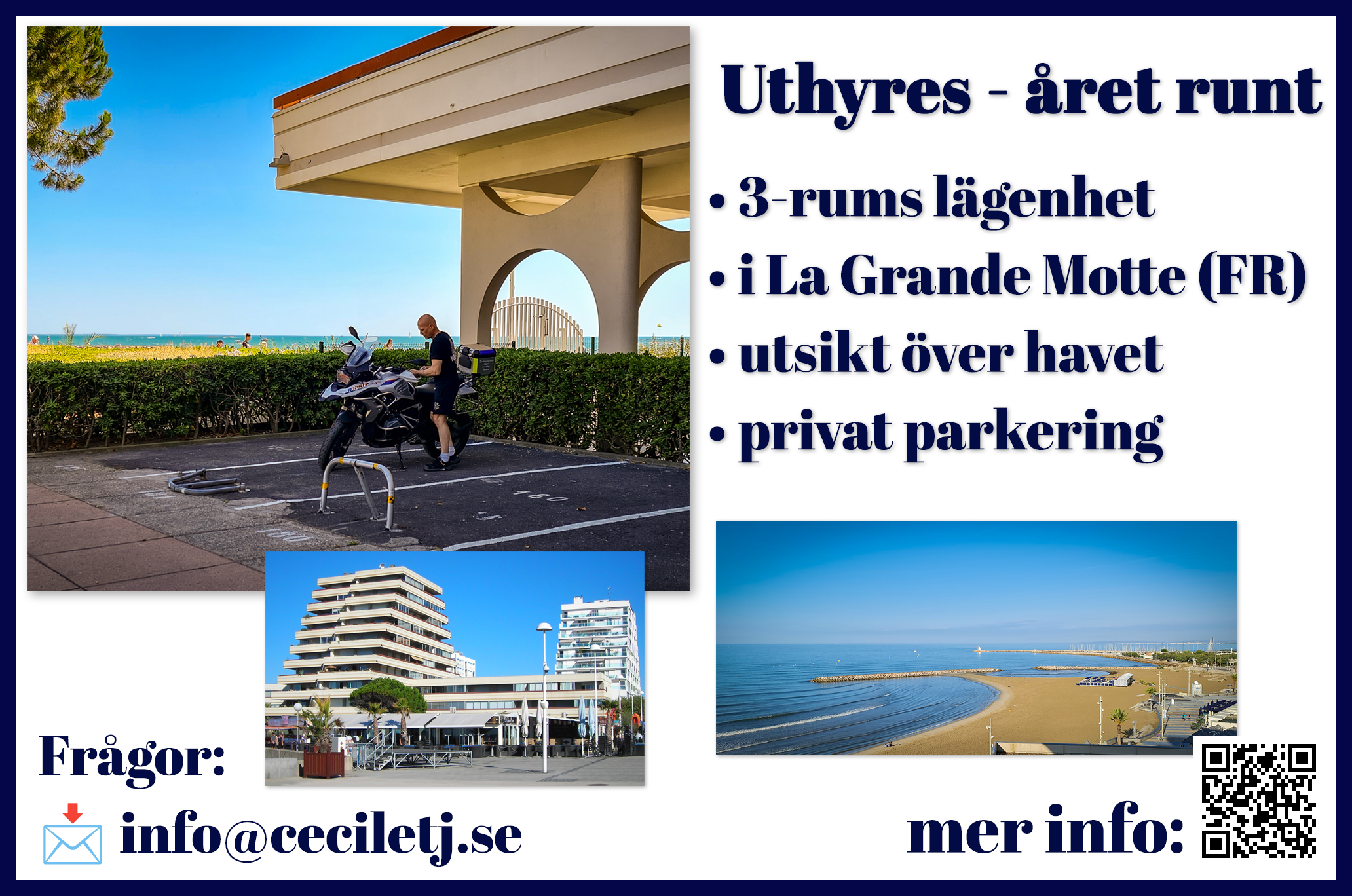 Vi hyr ut vÄr lÀgenhet i La Grande Motte (söder om Montpellier) i Frankrike. Man bor bokstavligt talat pÄ stranden och har en underbar utsikt över havet. SÄ om du planerar din semester och vill ha ett bra boende vid Medelhavet i sommar, övervÀg gÀrna den hÀr lÀgenheten. Du hittar mer information pÄ den hÀr sidan pÄ min egen webbplats: