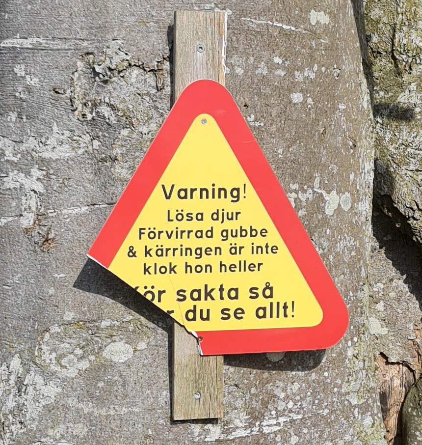 Vi passerar en bondgård där en varningsskylt sitter fastspikad på ett träd vid gårdens infart. Vad stod skrivet där? Jag hann inte läsa. Men eftersom jag också vill filma vägen med snön som ligger kvar i dikena, ber jag Mats vända. Han stannar framför trädet med varningsskylten vars nedersta vänstra kant är bruten: