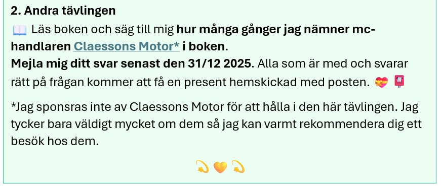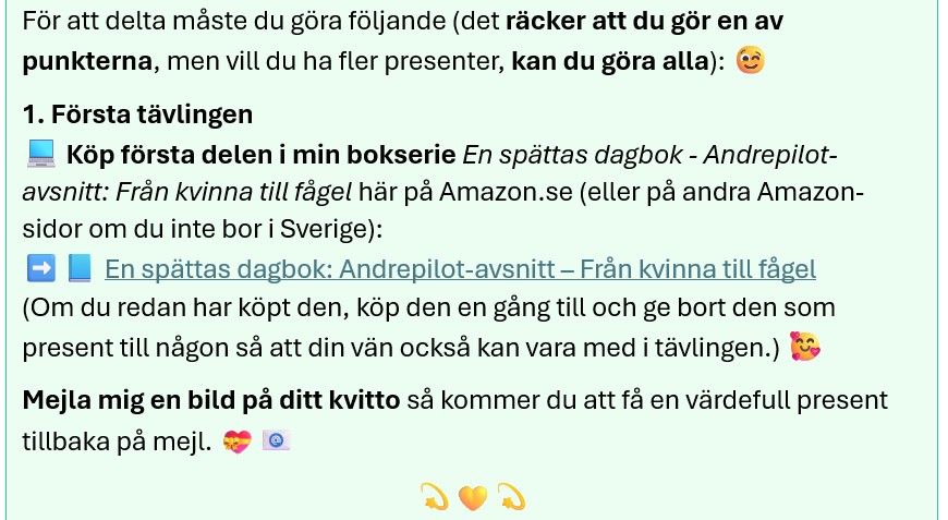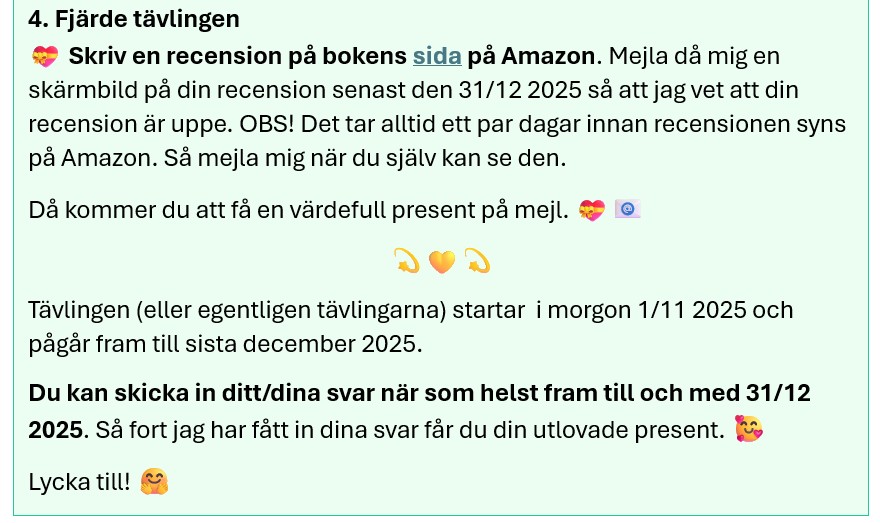 Sist men inte minst påminde jag deltagarna om min tävling som pågår till sista december. Tävlingen är om första delen i min bokserie En spättas dagbok. Det bästa med tävlingen är att alla som deltar vinner något. 💝